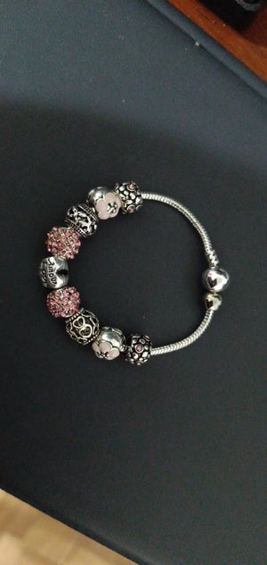 This silver charm bracelet effortlessly complements any outfit, making it perfect for daily wear or special occasions. With its love and flower beads, it adds a personal touch that reflects your style and story.