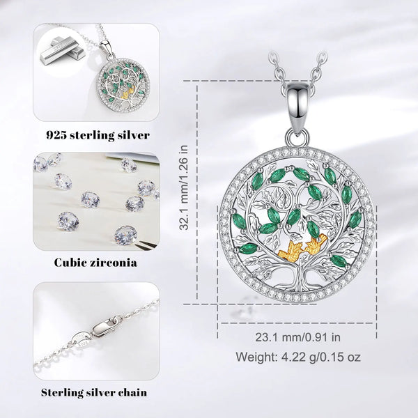 The pendant features a tree of life design elegantly set with green cubic zirconia leaves and a surrounding circle of sparkling cubic zirconia stones.