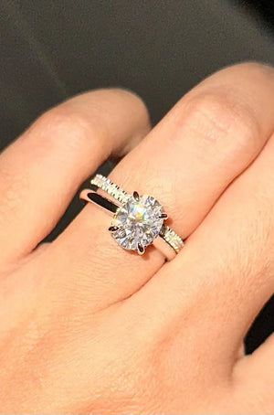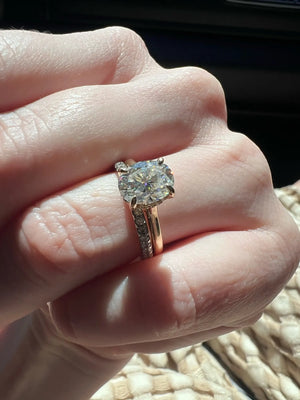 The ring features a stunning 2.0 Carat (9x7mm) Moissanite. Because of the oval shape's larger surface area, it actually looks even bigger and more brilliant than a round stone of the same carat weight.