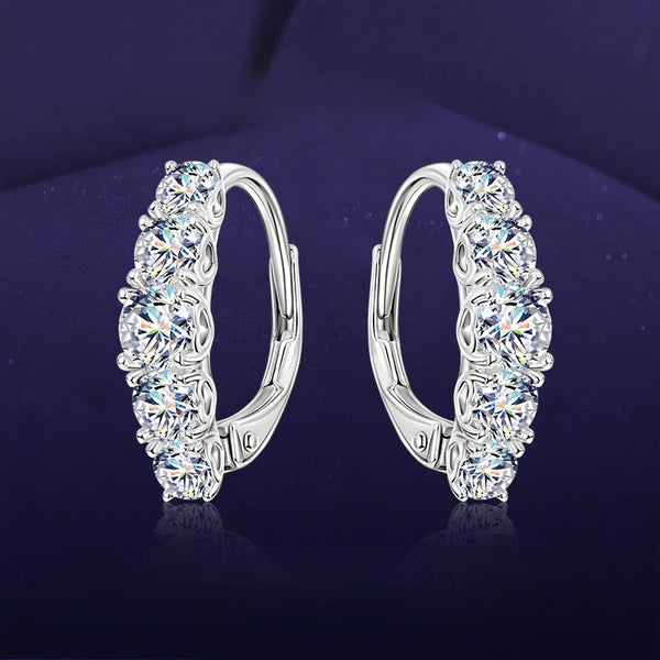 Everyday luxury. Five graduated Moissanites (1.8ctw pair) set in secure S925 silver huggies. Comfortable enough to sleep in, brilliant enough to shine.