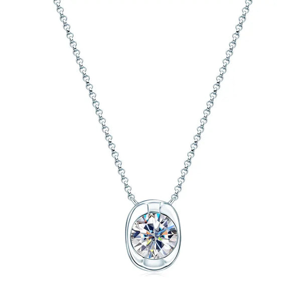 Réinventez le solitaire classique. Ce collier met en valeur une superbe moissanite ronde de 2,0 ct (8 mm) sertie dans une monture ovale en argent lisse et épaisse. Ce sertissage unique transforme la pierre ronde traditionnelle en un pendentif ovale élégant et sculptural, pour un style plus audacieux et contemporain qui s'accorde avec toutes vos tenues.