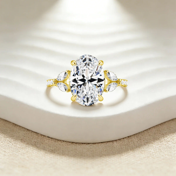 Why settle for a single sparkle when you can have a symphony? This ring is a masterclass in layering. It starts with a breathtaking 4.5ct Oval Moissanite center. To soften the transition, we added two Marquise Moissanites on each side, creating a floral-like embrace. Finally, the band is finished with 5 precision-set Zircons on each shoulder, adding a delicate trail of light. Crafted in Solid S925 Silver, it’s a complex, luxurious design that tells a story of abundance and grace.