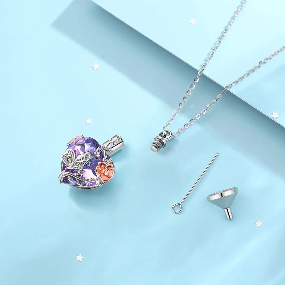 The Butterfly Rose Memorial Pendant features a secure compartment designed to safely hold ashes, keeping them close to your heart.