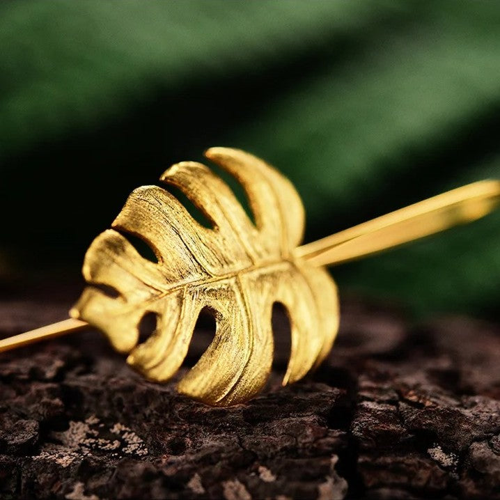 The intricate gold monstera leaf design offers a distinctive and stylish look.