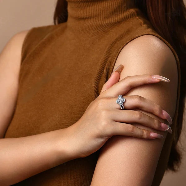They say finding a four-leaf clover brings a lifetime of luck. We’ve captured that magic in stone. This ring features a clever Cluster Setting: four individual Moissanite gems come together to create a flower of light, surrounded by a halo for maximum impact. Unlike flimsy bands, this piece weighs a substantial 4.5 grams in Solid S925 Silver. It feels expensive, grounded, and empowering on your finger. A daily talisman of faith, hope, love, and luck.