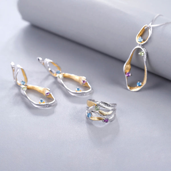 Brighten up your look with vibrant multi-color gemstones. Each piece in this set is designed to add a touch of color and sparkle, lifting your mood and style.
